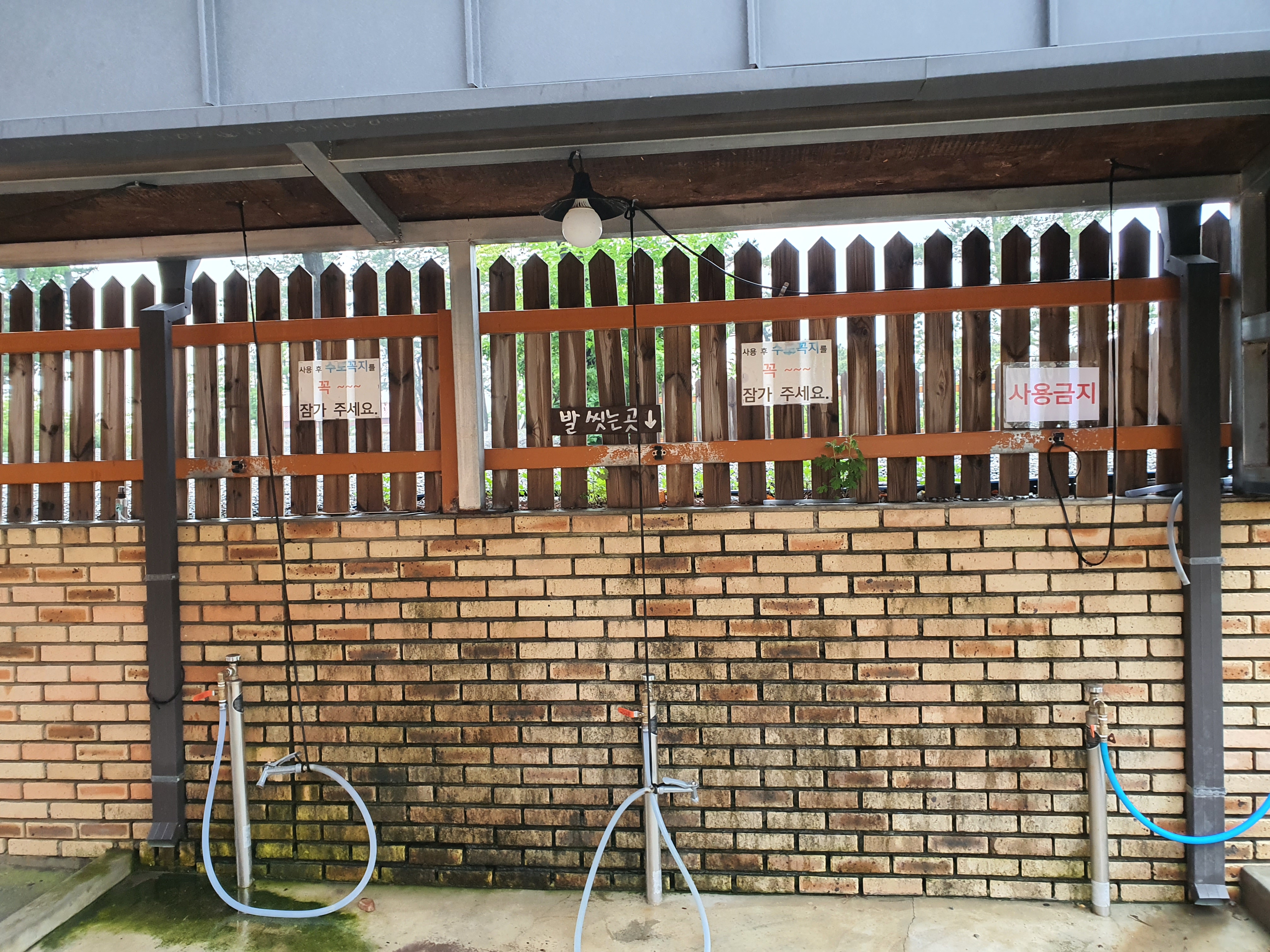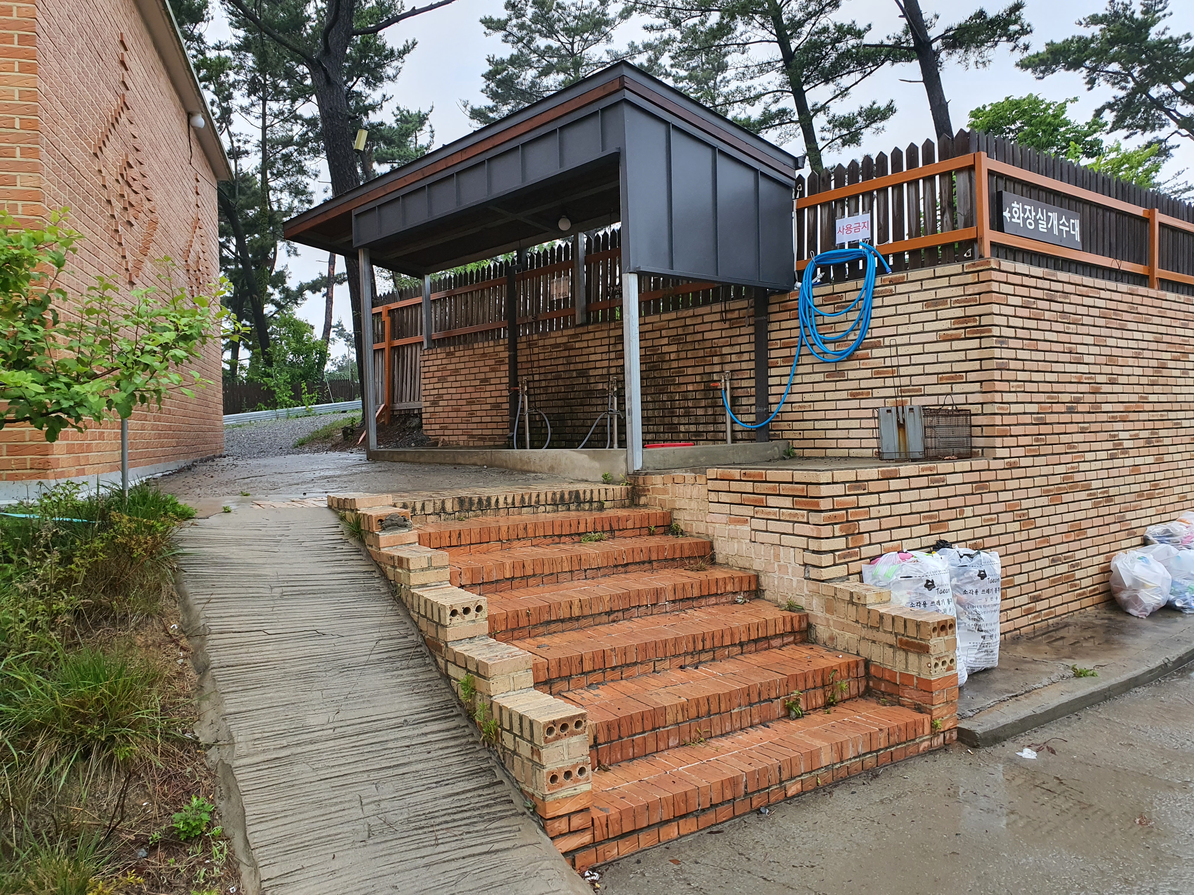 관리실 옆에 발 씻는 곳이 있고 그 위로 올라가면 분리수거장, 샤워실, 화장실, 개수대가 있습니다.